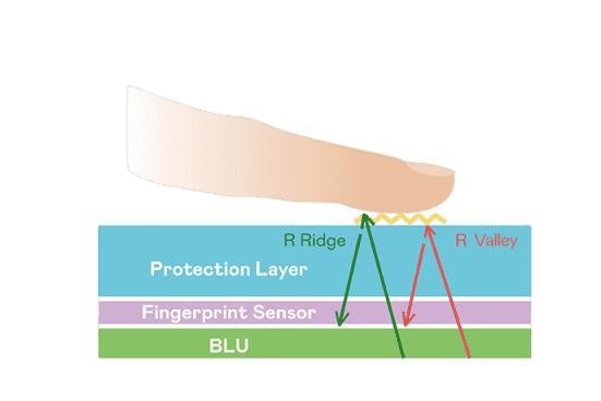 TFT 指纹扫描感测技术利用薄膜电晶体 (TFT) 当作光感测元件,,,藉由非晶硅 (a-Si) 与低温多晶硅(LTPS)既有光电转换特性对不同波段光源进行吸收,,,使感测 IC 读取阵列感测元件的光漏电差异,,转换成数位灰阶影像。。。